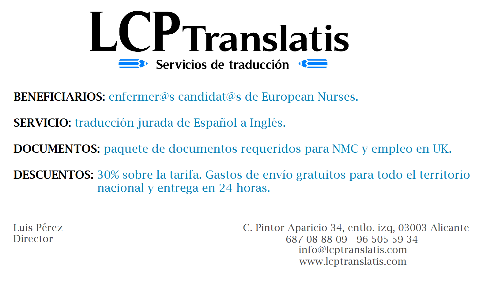 Nosotros disponemos de un traductor jurado en Alicante, que además de ser un excelente profesional cuenta con experiencia en la traducción y gestión de documentos para el NMC. Para nuestros candidat@s realiza un paquete especial con un descuento muy significativo en el precio. (La información y sus datos de contacto aparecen al final de la página)